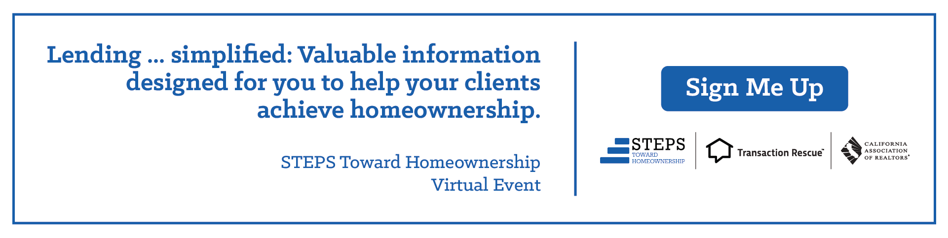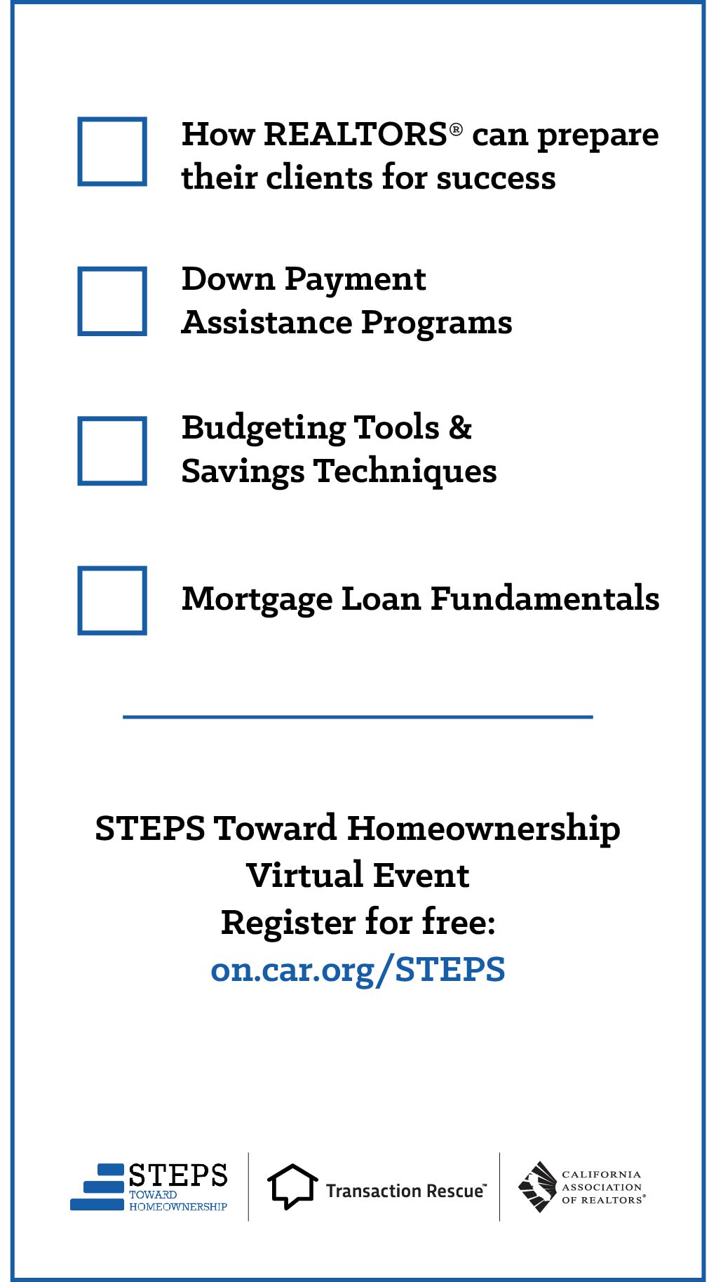.The CALIFORNIA ASSOCIATION OF REALTORS® STEPS Toward Homeownership addresses housing affordability from the perspective of financial literacy. Did you know over half of all renters in California thought you needed at least 20% down to purchase a home? The reality is there are programs available that enable a purchase with much lower down payments.  This program brings relevant information to our members about credit scores, financial planning, leveraging down payment resources and options for low to moderate income earners so that we can educate our buyers. The CALIFORNIA ASSOCIATION OF REALTORS® supports RESPONSIBLE Homeownership.